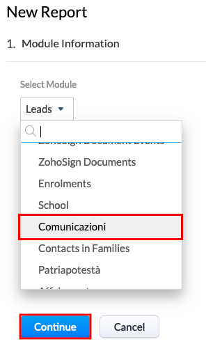Scorri il menù fino a “Comunicazioni”, o cercalo nel box di ricerca, e premi “Continue”.