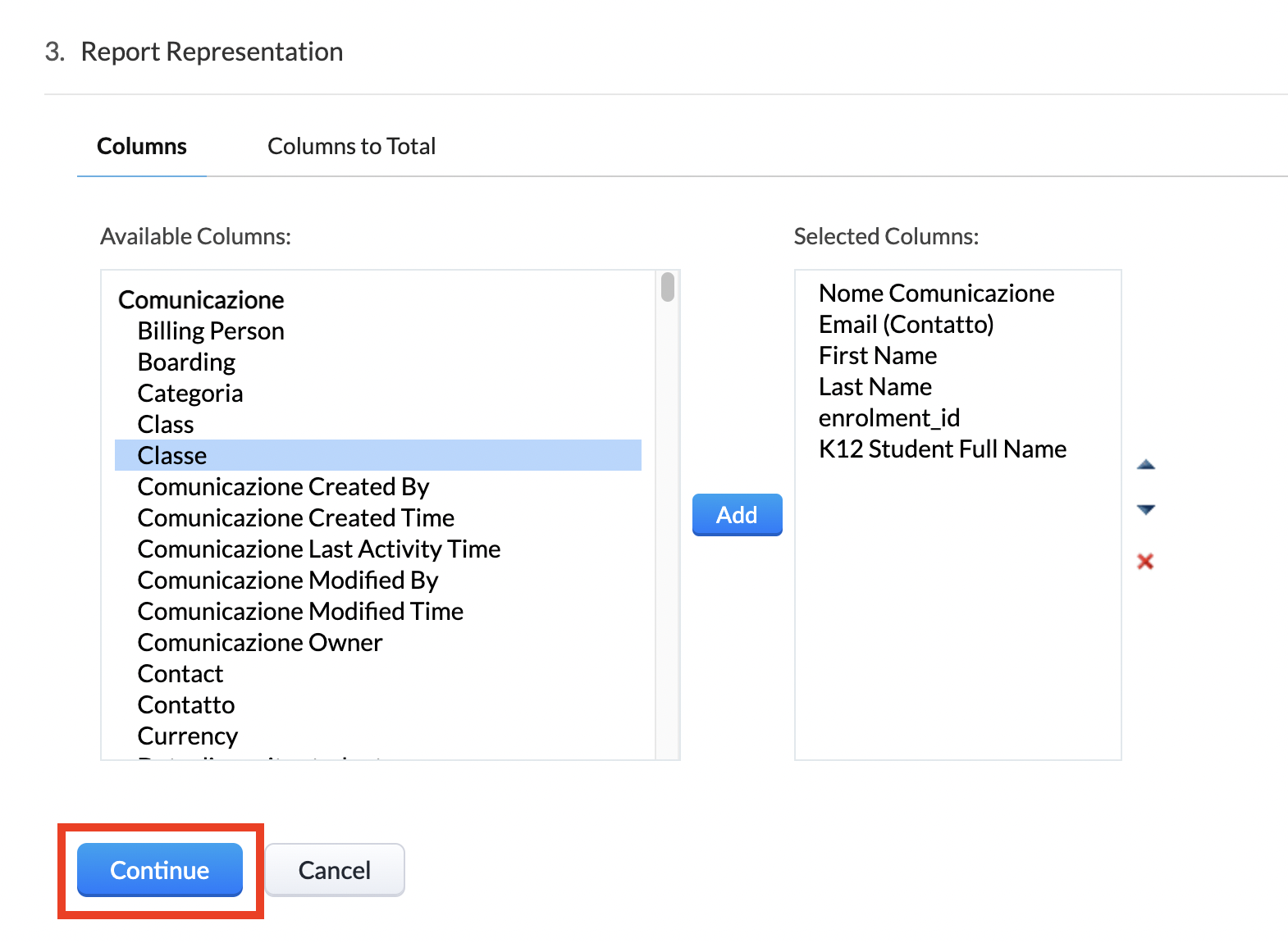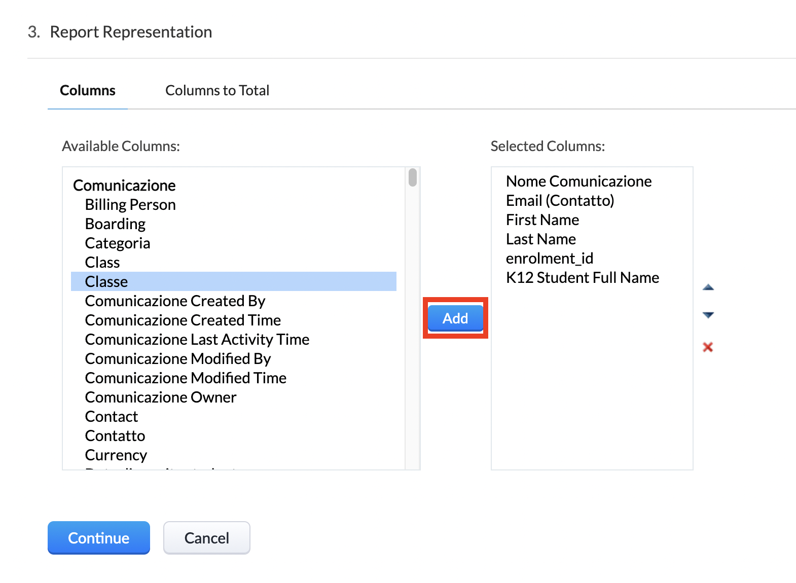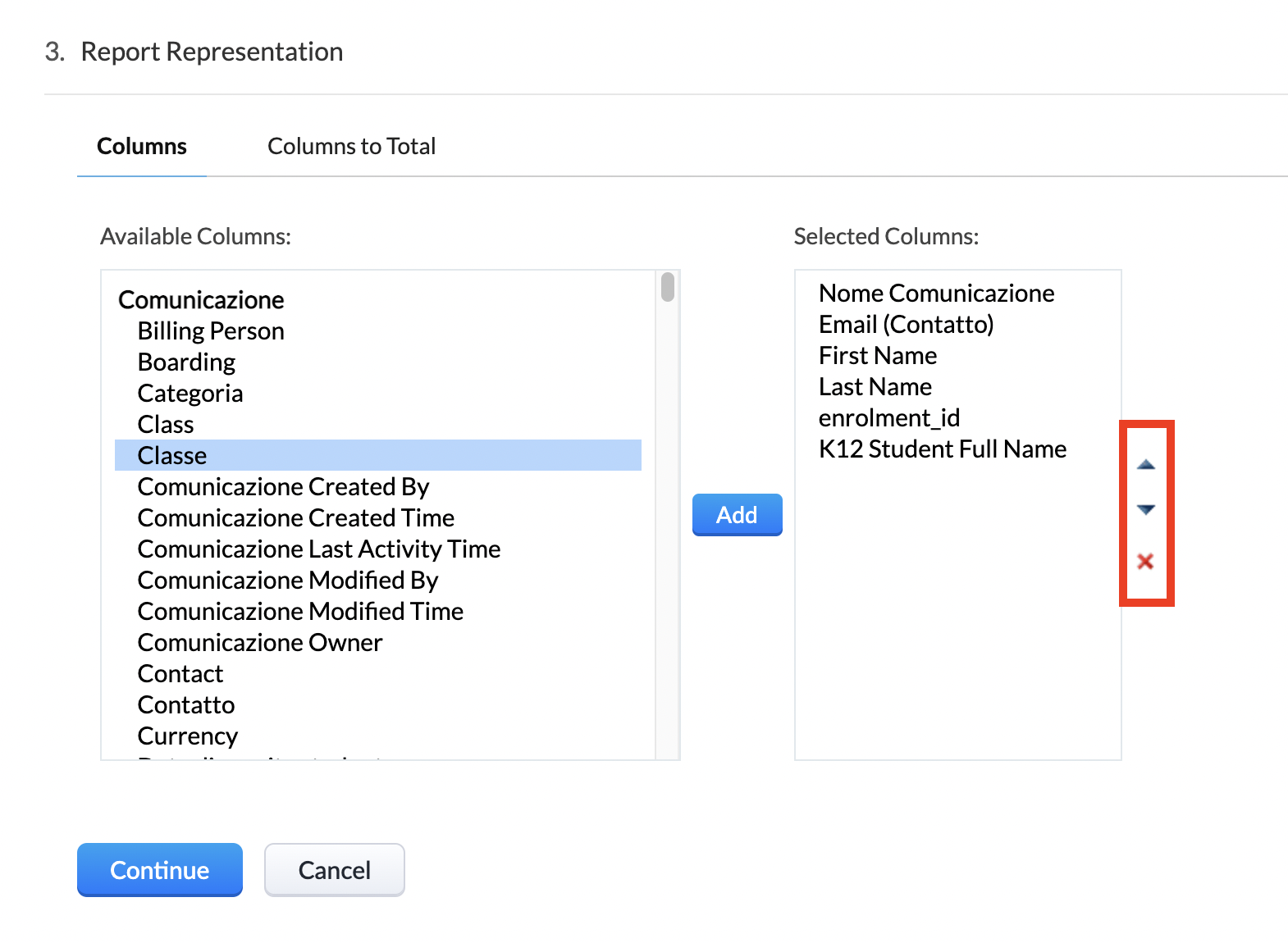 Se tra le informazioni delle colonne selezionate (elenco a destra) ci sono informazioni che non vuoi mostrare nel report finale, o vuoi cambiare l'ordine in cui vengono mostrate, selezionale individualmente dall’elenco a destra e usa i comandi a lato.