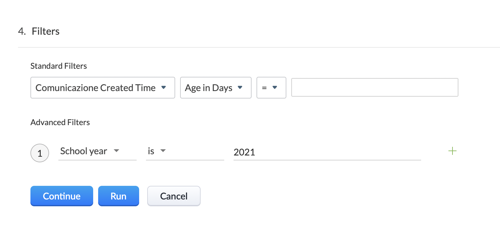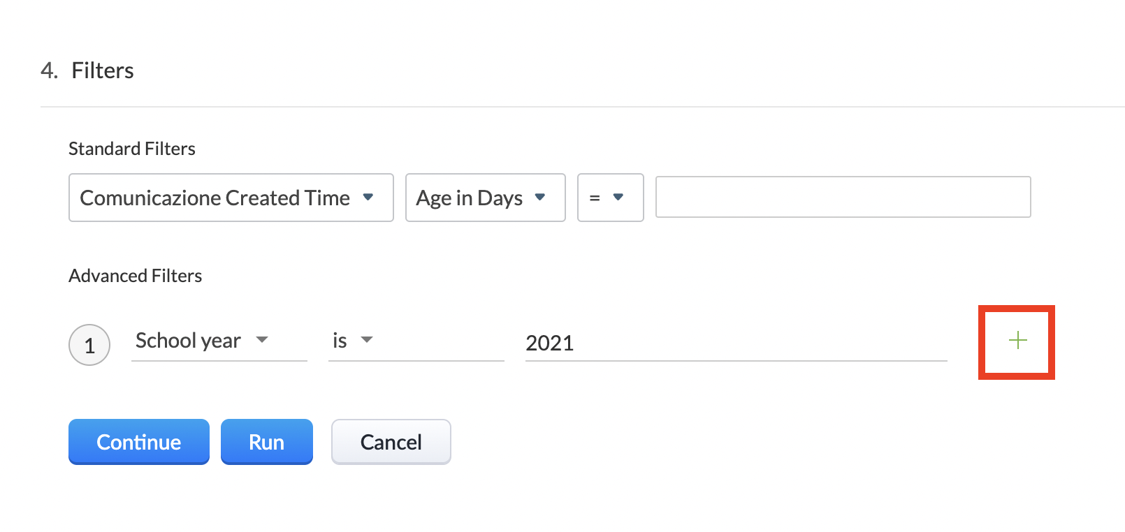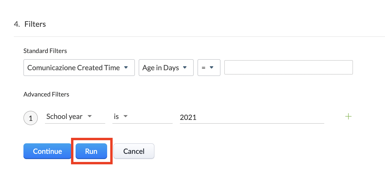Lascia invariata la sezione “Standard Filters”, e dalla sezione “Advanced Filters” seleziona i criteri per visualizzare la classe, l’anno o la sede desiderata.