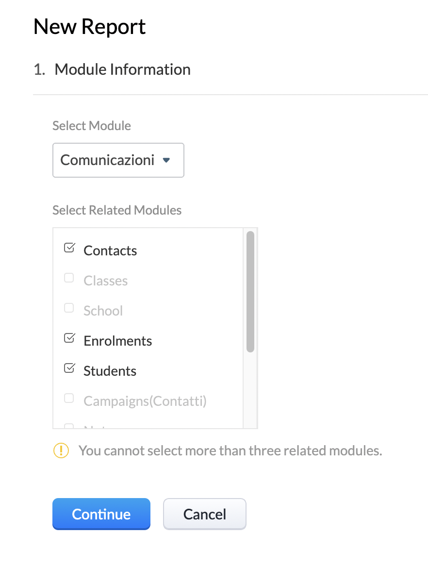 Seleziona i moduli che vuoi visionare e premi “Continue” per proseguire.